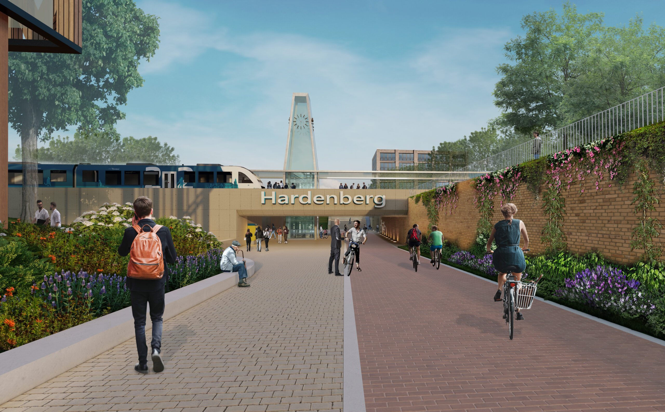 HARDENBERG – Op de tekening is de nieuwe stationsomgeving van Hardenberg al ontstaan. Het treinstation is in oostelijke richting verplaatst en onder de wachtende treinen kunnen fietsers en wandelaars van het centrum naar het ziekenhuis via de Saxenlaan. Tussen de perrons is wachtruimte. De gemeenteraad praat dinsdag 7 oktober over de plannen.