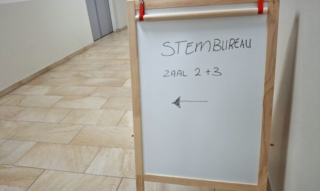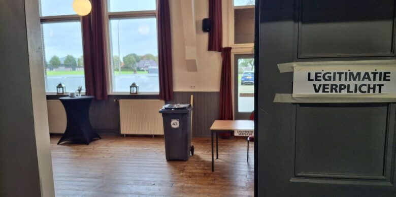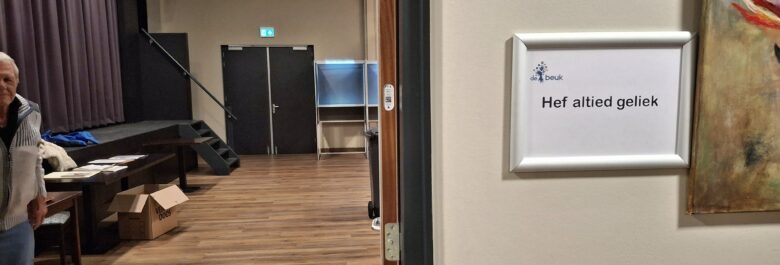 Bij het stembureau in MFA De Beuk in De Krim kan een stemmer het niet fout doen. De stembus staat in een zaal met de titel ‘Hef altied geliek’. Om 15.49 uur is de opkomst dan 43 procent. “Maar de hoos komt na het avondeten”, is de verwachting. De stembureauleden zijn er op gerust dat zij ’s avonds voor het tellen voldoende aflegruimte hebben. “We kunnen altijd die deur openen en dan staan wij in de sporthal”, klinkt het lachend.