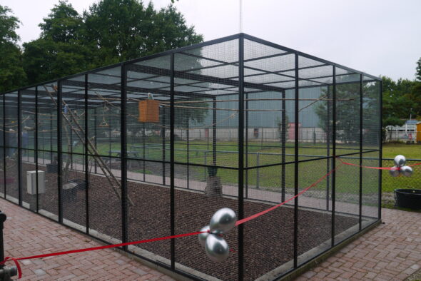 Hoekstra sprak zijn waardering uit voor de vrijwilligers die de volière eigenhandig in weer en wind hebben opgebouwd. In het nieuwe onderkomen verblijven ongeveer dertig vogels, allemaal geschonken aan de kinderboerderij. Vier parkieten die de slachtpartij hebben overleefd, hebben inmiddels ook hun plek gevonden in de ruime volière.