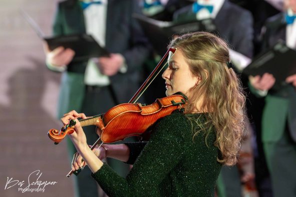 Het publiek werd verder verrast door de indrukwekkende solo-optredens van Judith Godeke, die met haar stem de aanwezigen zichtbaar raakte, en Cloë Elsenaar, die met haar virtuoze vioolspel zeker tot haar recht kwam in de Hoeksteen.