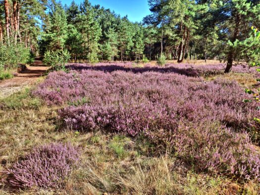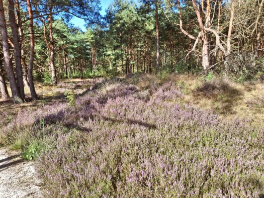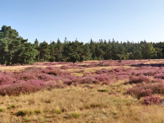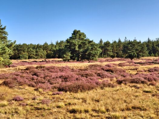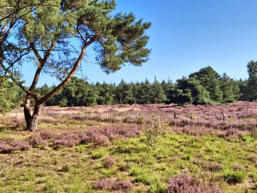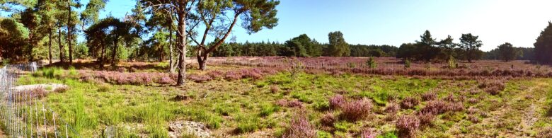 ARRIEN – Hekwerk geeft aan dat er onderhoud wordt verricht op natuurbegraafplaats Hoogengraven in Arriën. De werkers zijn niet in zicht. Zij verstoppen zich in een bosje. De prachtige paarse heide kan hen tot aan het middaguur nog niet lokken.