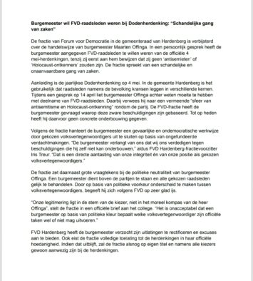 “De gevoeligheden rond dit onderwerp, in relatie tot uitlatingen van leden van de landelijke FVD die niet in lijn zijn met de beginselen en betekenis van de herdenking, waren voor het college aanleiding om hierover in gesprek te gaan met de lokale fractie”, aldus de verklaring. Dat gesprek was op 14 april. “Daarin is verkend hoe deelname het best kan bijdragen aan een waardige en verbindende herdenking. De fractie toonde begrip voor mijn openhartigheid en overwegingen en gaf daarbij ook aan dat zij de verwijzing naar uitspraken van landelijke FVD’ers als ongemakkelijk ervaart. Besproken is om hierover verder met elkaar in gesprek te gaan.”
