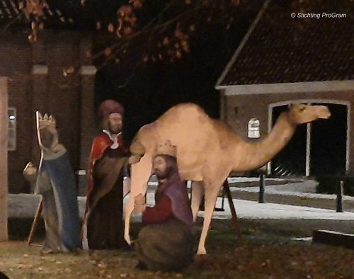 Naast de boom is een kerststal geplaatst. Met verschillende dieren, zoals een kameel, schapen en een os, Maria, Jozef en de drie Koningen. Het kleurrijke kersttafereel is te zien tot het eind van het jaar.