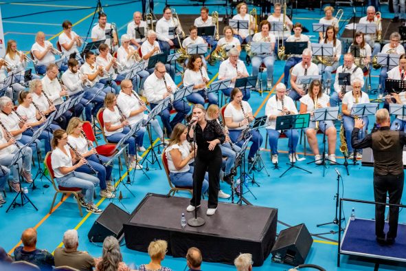 In een volle sporthal vond het jaarlijkse Megaconcert plaats, dit jaar met maar liefst 109 enthousiaste muzikanten van 8 tot 78 jaar. Er werden mooie luisternummers ten gehore gebracht, een medley van nummers van Queen, maar ook voor de liefhebbers van blaasmuziek bekende nummers als Choral and Rock Out en Fascinating Drums. Lynn Bril vertolkte op prachtige wijze de nummers Valerie van Amy Winehouse en Radar Love van Golden Earring. Presentatrice Monique Eshuis begeleidde het publiek door het programma. Onder leiding van dirigent Wout Eshuis bracht het orkest, na een korte voorbereidingstijd van een paar uren, een prachtig concert ten gehore wat werd gewaardeerd met een staande ovatie van het publiek.