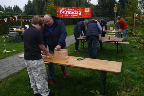 De wijk Kotermeerstal Zuid stond in het teken van ontmoeting en gezelligheid. In de ochtend werkten jong en oud zij aan zij bij het maken van vijftig vogelhuisjes. Vijfentwintig daarvan krijgen een plek in het eikenlaantje van het natuurgebied, zodat kool- en pimpelmezen zich er kunnen vestigen en helpen bij de bestrijding van de eikenprocessierups. De overige kastjes mochten de deelnemers meenemen naar hun eigen tuin.